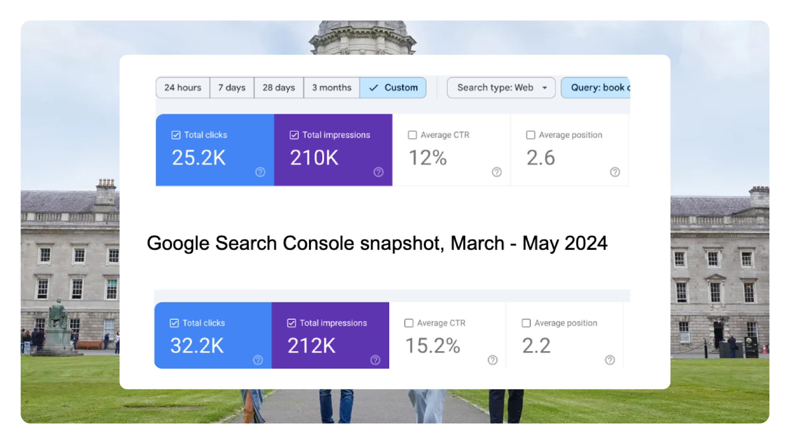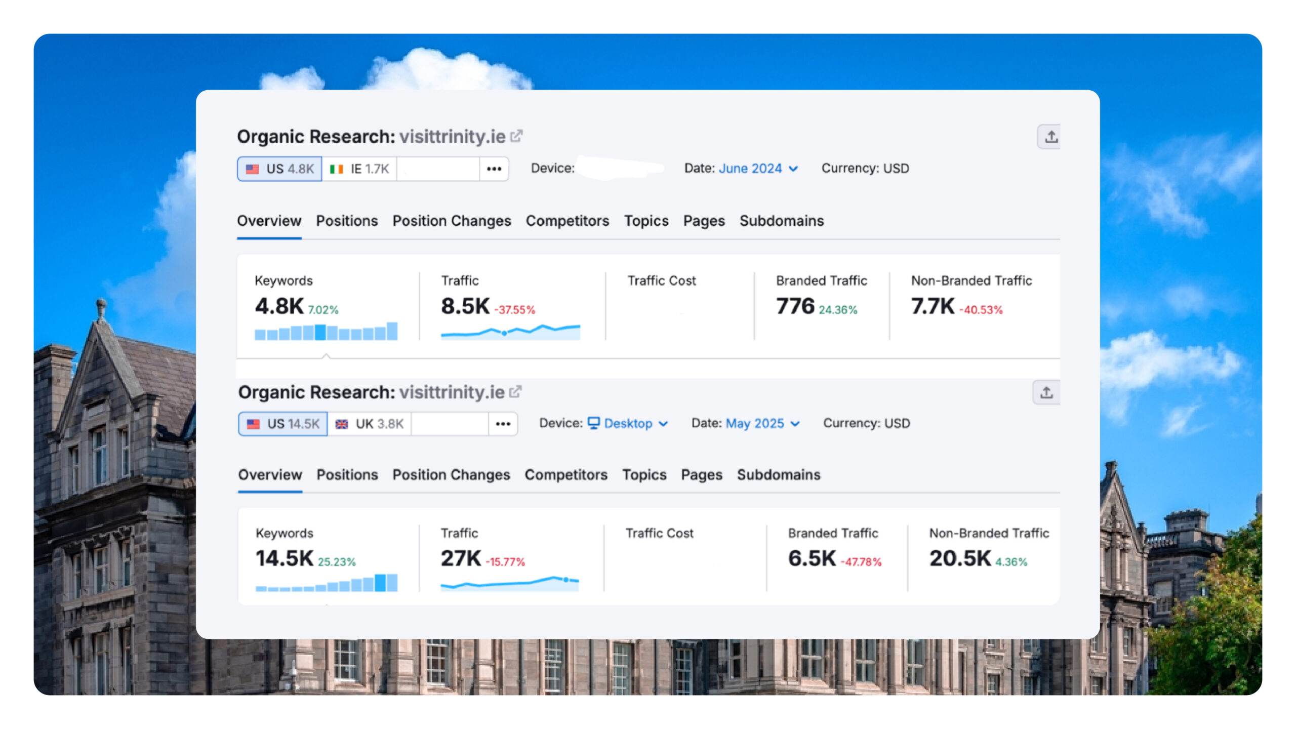SEMRush keyword growth: The number of keywords Visit Trinity ranks organically for in the US market vastly increased, moving from 4,371 on August 1st, 2024, to 14,625 by June 26, 2025 – a staggering 235% increase.Branded traffic growth: Google Search Console snapshot, March – May 2025Organic traffic from USA and Canada to Things to do in Dublin pageThings to do in Dublin page data: Organic keyword growth for Things to do in Dublin page (SEMRush snapshot taken Jun 26, 2025)